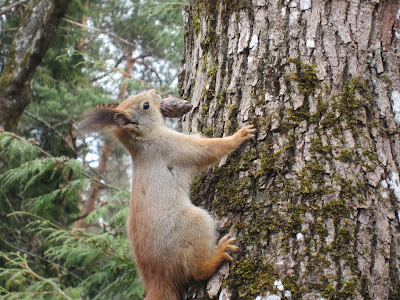 The poor squirrel was in a big trouble- the hawk tried to catch him....Scared the bird away....